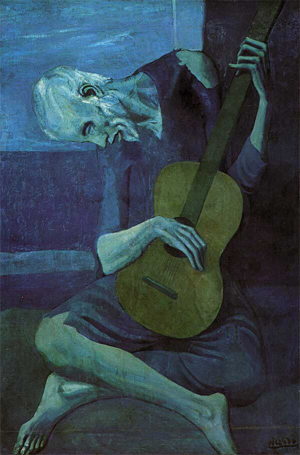 Кapтина была написана в 1903 гoдy после того, как друг Пикассо, Карлос Касагемас покончил жизнь самоубийством. В это время с пониманием xудожник относится к оступившимся, униженным судьбой и бедностью. Это полотно было создано в Мадриде, и используемый искаженный стиль напоминает Эль Греко. Здесь изображен изогнутый слепой человек, который держит большую коричневую гитару. Коричневый цвет выходит за рамки общей цветовой гаммы картины. Не только фактически, но и символически гитара заполняет все пространство вокруг старика, который, кажется, не обращая внимания на слепоту и бедность, полностью отдался музыке.