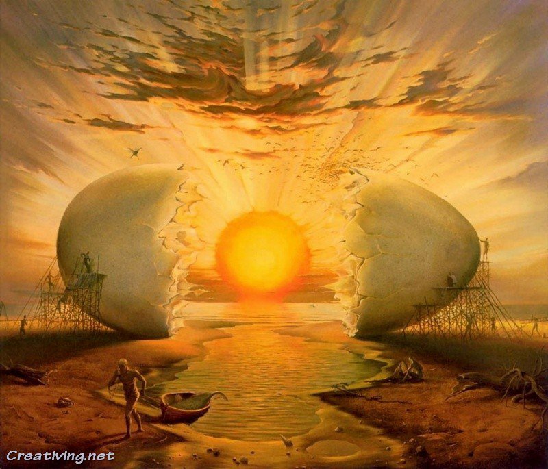 Картина для меня кажется страшной и я там вижу желток и белок яйца. Я не понимаю смысл этой картины. Вижу людей, которые строят белок, а другой человек бежит.
