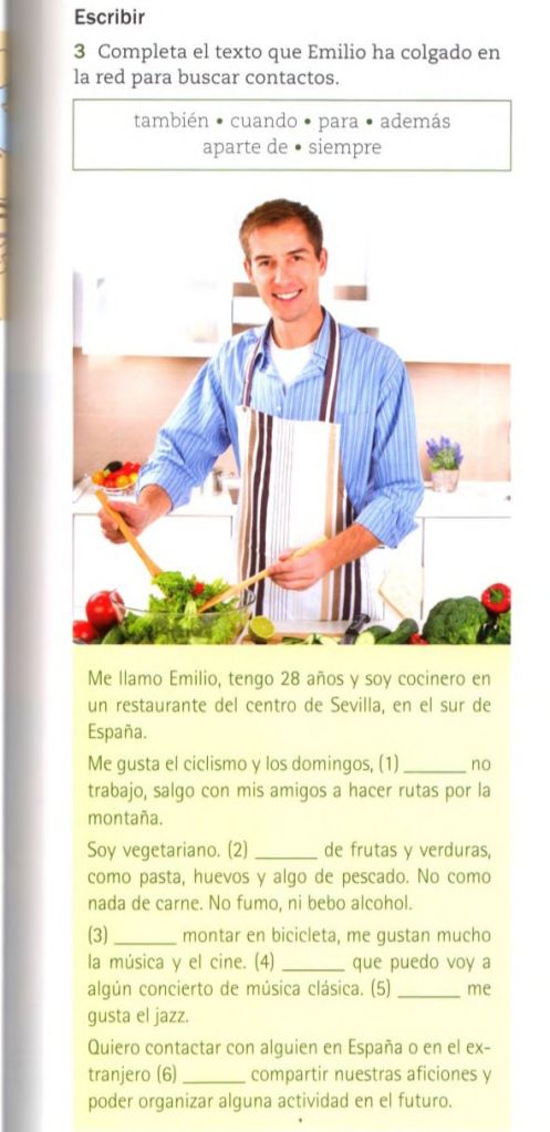Me llamo Emilio , tengo 28 años y soy cocinero en un restaurante del centro de Sevilla , en el sur de España. Me gusta el ciclismo y los domingos, cuando no trabajo, salgo con mis amigos a hacer rutas por la montaña . Soy vegetariano. Ademas de frutas y verduras, como pasta, huevos y algo de pescado . No como nada de carne . No fumo , ni bebo alcohol. Aparte de montar en bicicleta , me gustan mucho la música y el cine . Siempre que puedo voy a me algún concierto de música clásica . También gusta el jazz . Quiero contactar con alguien en España o en el ex tranjero aparte de compartir nuestras aficiones y poder organizar alguna actividad en el futuro .