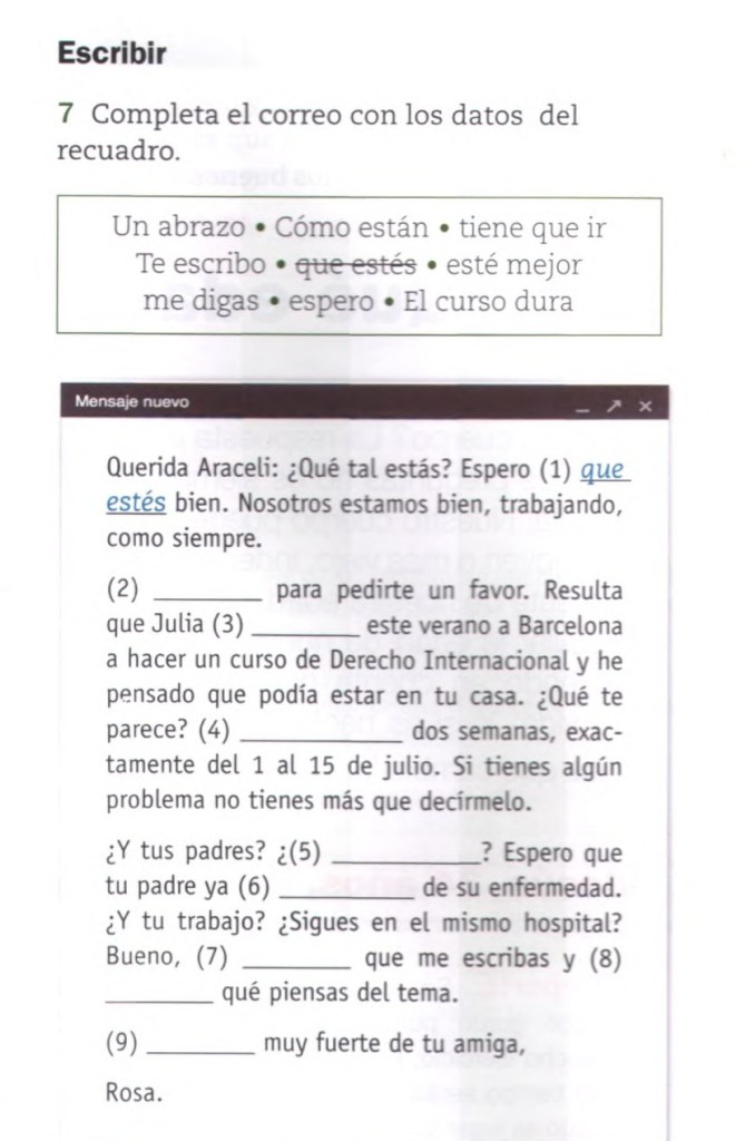 2. Te escribo, 3. Tiene que ir, 4. El curso dura, 5. ¿Como estan?, 6. Este mejor, 7. Espero, 8. Me digas, 9. Un abrazo.